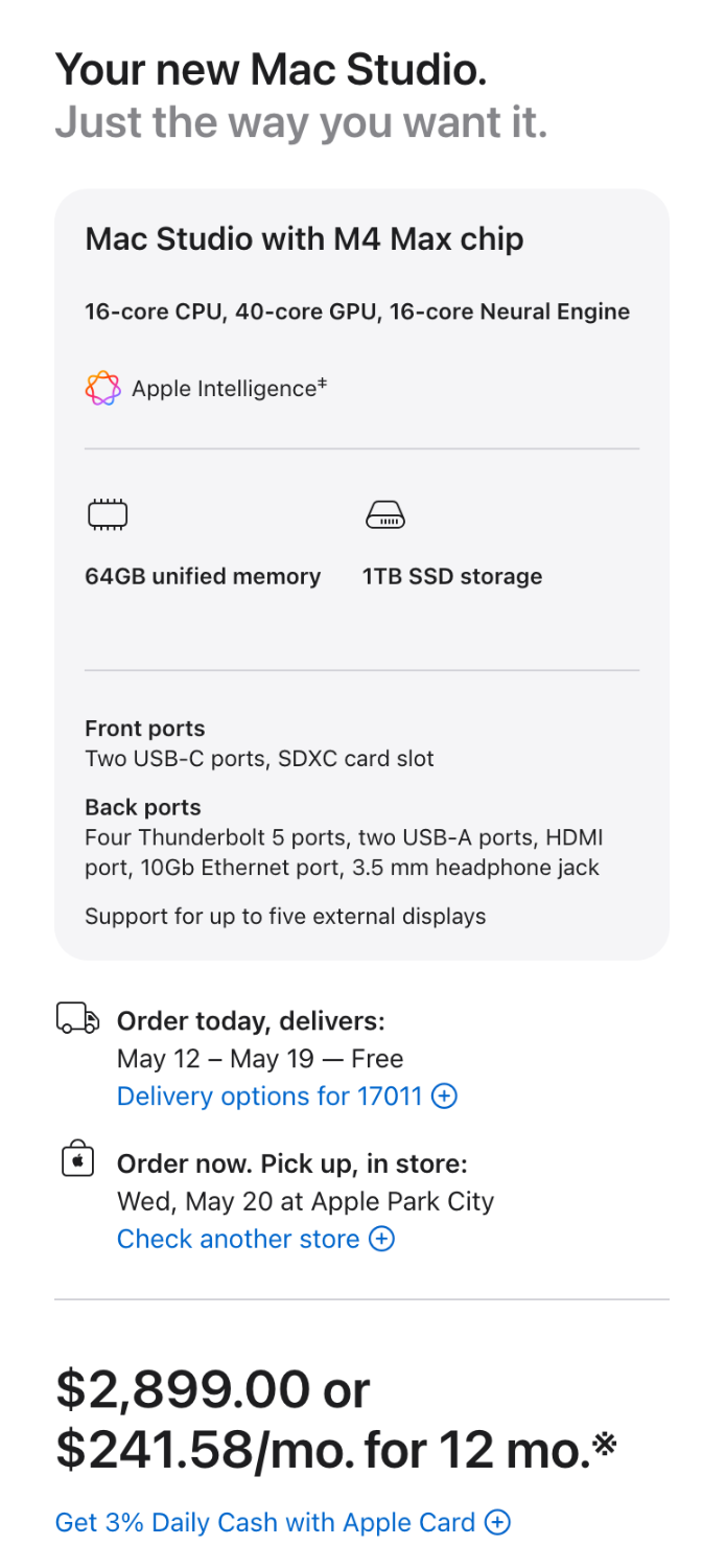 The current Mac Studio is still decent in 2026, but personally...I'm waiting for the refresh that has a M5 Chip. Apple really has changed their website, but my previous WTB Article still applies. Here are some screen-shots: Between a Mac Studio and a Mac Mini, I'm going to lean towards the Mac Studio. If you want to wait until the M5 hits a Mac Studio, you are probably going to wait until late this year or a better prediction...this time next year. Things are in such turmoil with all this MicroSlop / AI / Data Center Crap, that things like Memory and HD storage chips are at a premium and are very scarce. In fact, when I tried to configure a tricked-out Mac Mini, it was a 12-16 week delay! Oh, don't forget to add a Macintosh Studio Display for $1600, whatever you buy. So since 2026 is completely fucked technology-wise, I'm really not sure what to tell you. I would just keep saving at this point and be prepared to jump on any deals. That said, Apple controls the prices, so I wouldn't hold out for any "deals." Just be ready to buy when the time comes. As to what I recommend, it will be the Mac Studio.